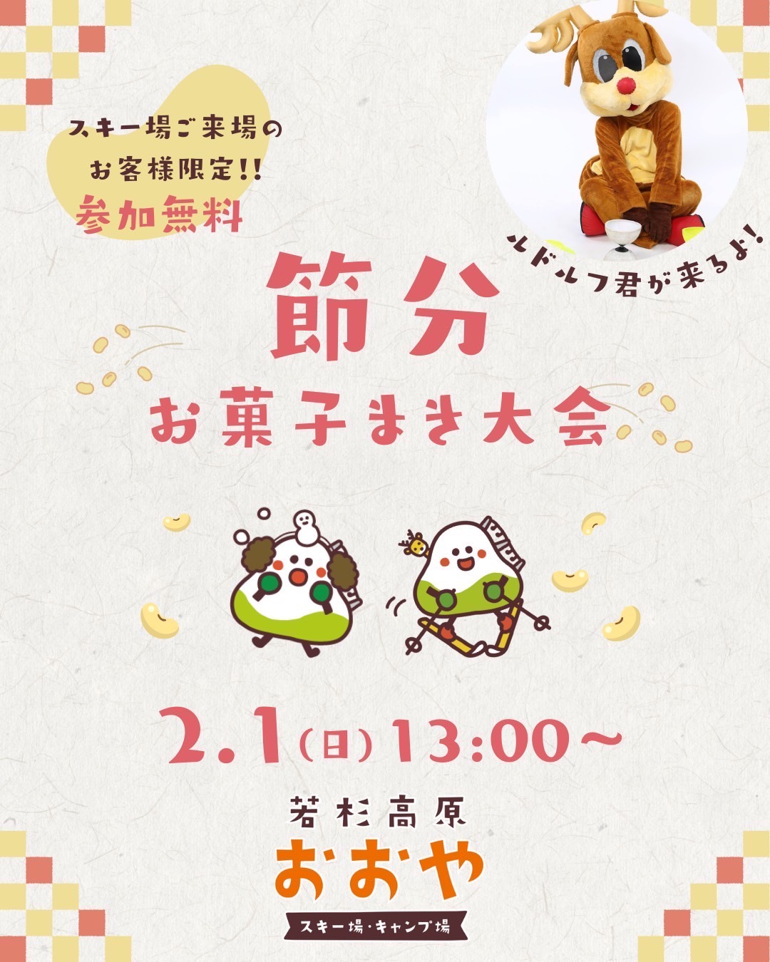 ⭐️イベントのお知らせ⭐️ 2月1日(日)におおやスキー場でお菓子まき大会があるよー! なんと‼︎ルドルフ君もかけつけてくれるよー ...